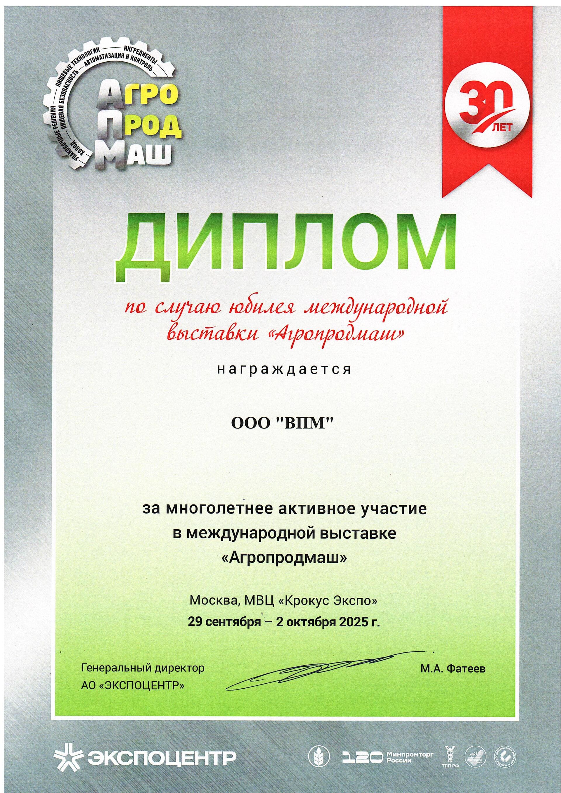 С 29 сентября по 2 октября в МВЦ «Крокус Экспо» прошла 30-я юбилейная международная выставка оборудования, технологий, сырья и ингредиентов для пищевой и перерабатывающей промышленности «АГРОПРОДМАШ-2025».
